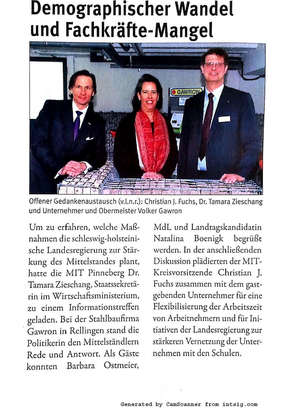 Bild von links nach rechts: Christian J. Fuchs, Unabhängiger Versicherungsmakler und Vorsitzender der Mittelstands- und Wirtschaftsvereinigung, Dr. Tamara Zieschang, Staatssekretärin im Wirtschaftsministerium und Volker Gawron, Geschäftsführer der Gawron Werke und Obermeister der Metallinnung.